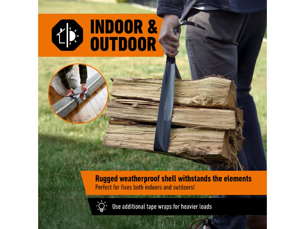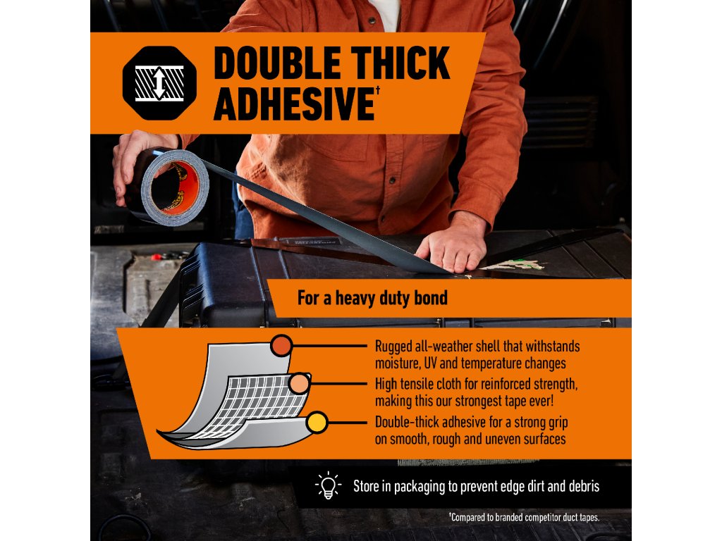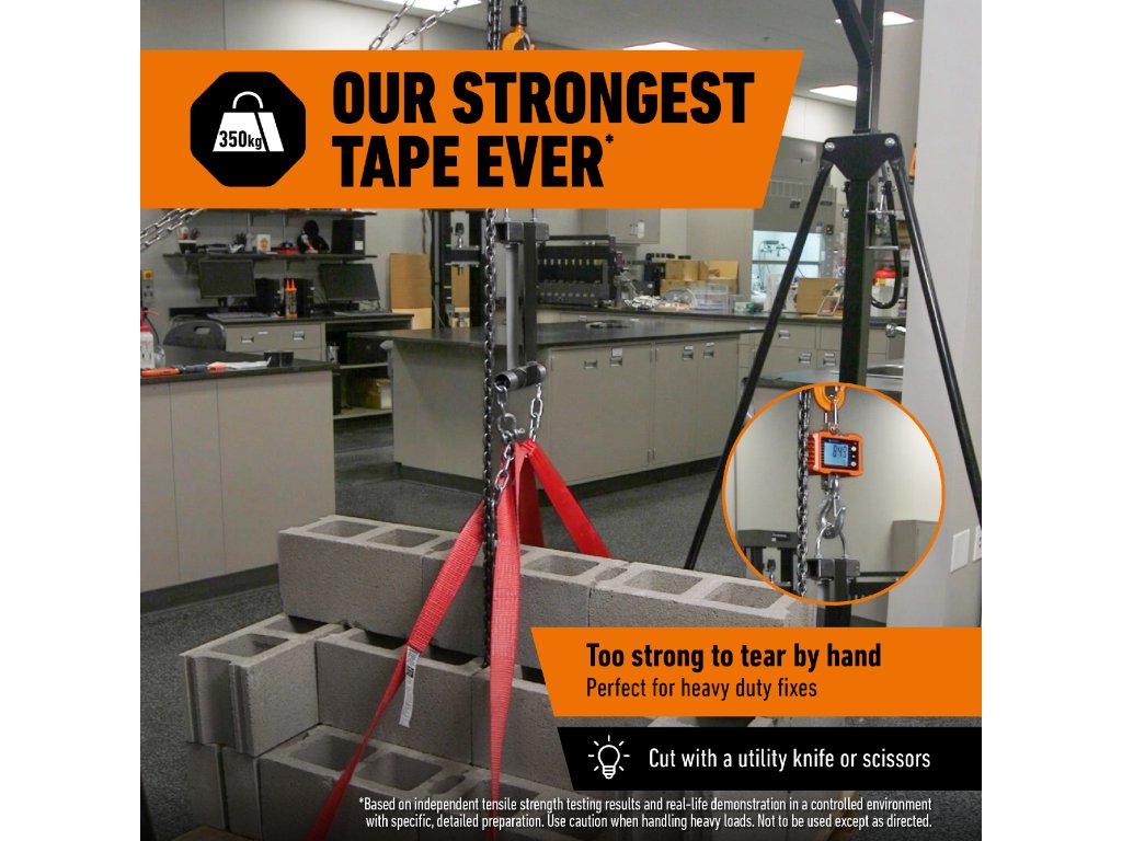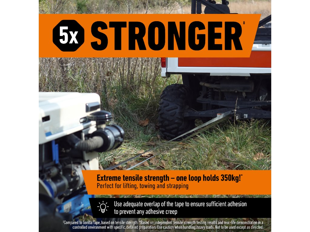 * Na základě výsledků nezávislých testů pevnosti v tahu a praktických ukázek v kontrolovaném prostředí s konkrétní, podrobnou přípravou. Při manipulaci s těžkými břemeny buďte opatrní. Nepoužívejte jinak, než je uvedeno v návodu. Porovnáno se značkovými konkurenčními lepicími páskami a s lepicí páskou Gorilla Tape, na základě pevnosti v tahu.