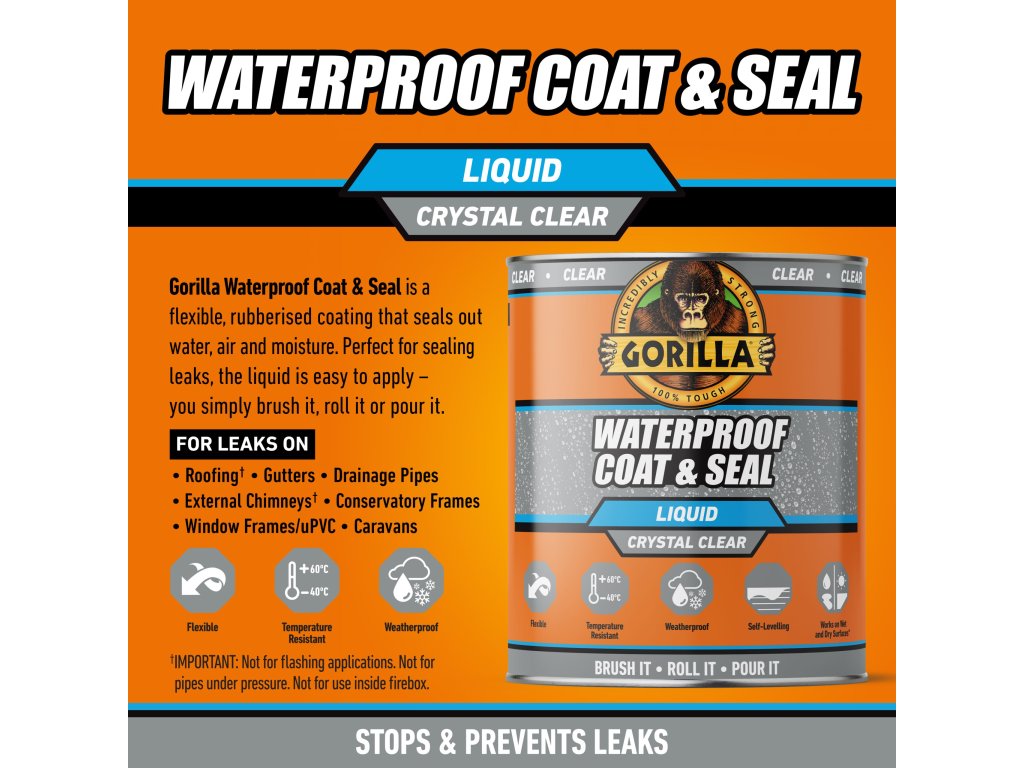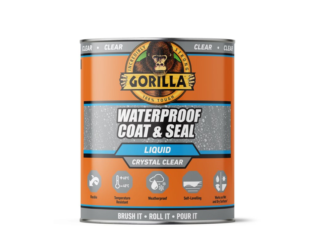 Gorilla® Waterproof Coat & Seal je pružný pogumovaný nátěr, který nepropouští vodu, vzduch a vlhkost. Je ideální pro opravu netěsností a snadno se nanáší - jednoduše ji nanesete štětcem, rozválíte nebo nalijete. Produkt je samonivelační, těsní a chrání tím, že hladce zakrývá malé mezery a praskliny a vytváří vodotěsný povrch odolný proti povětrnostním vlivům.